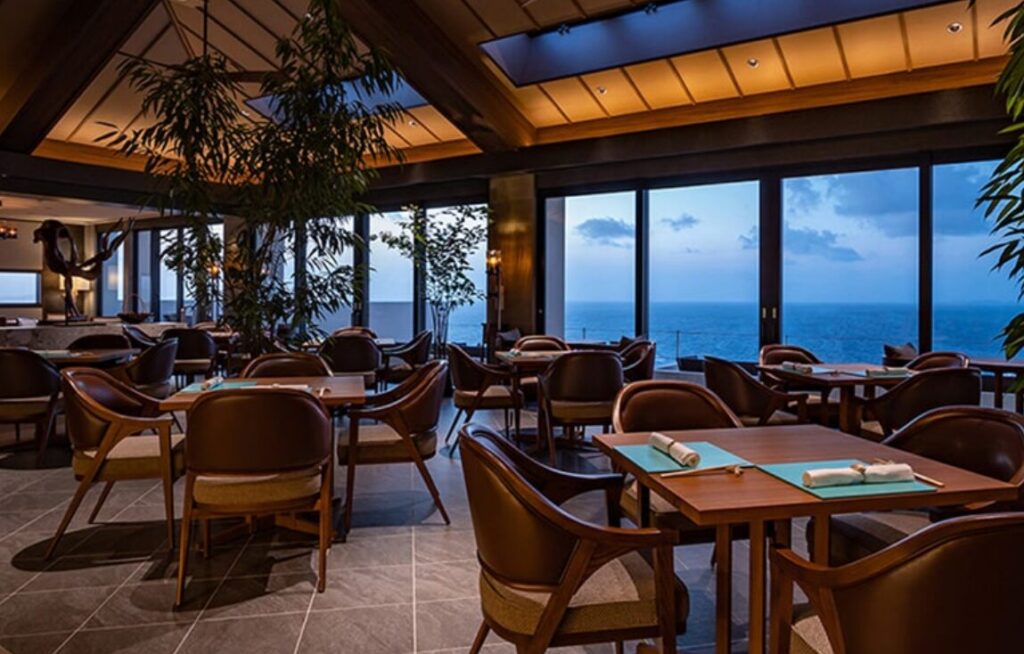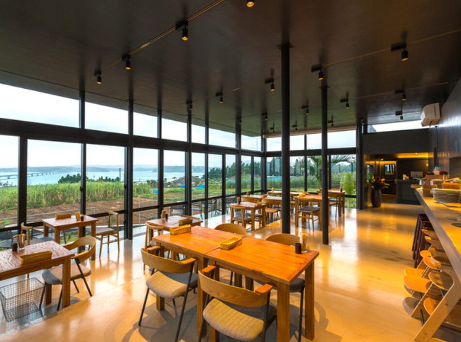 大きな窓からは海や古宇利大橋が一望でき、日没の時間にはドラマチックなサンセットが広がります。食事をしながら空の色の変化を楽しめるのも、このレストランならでは。夜には満天の星が広がり、非日常感を一層高めてくれます。