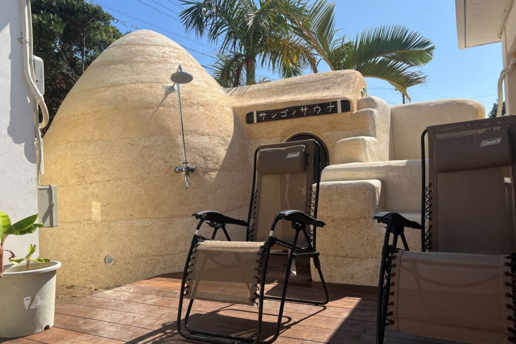 宿泊者限定で楽しめる、世界初のサンゴで作られたアースバッグサウナ。