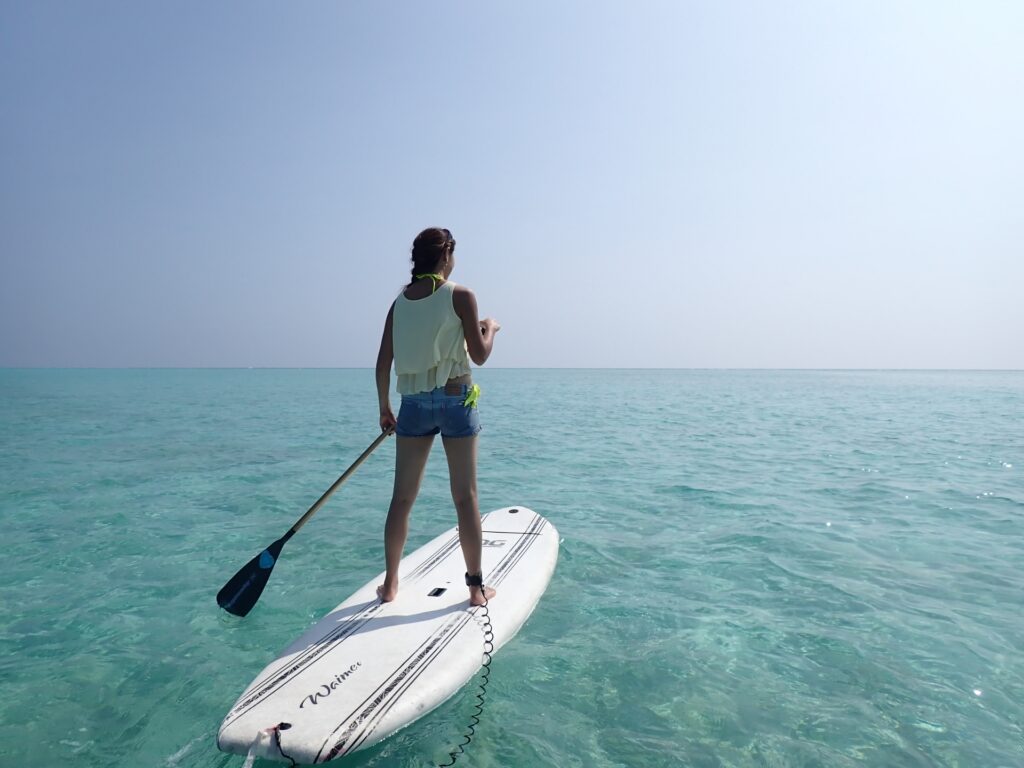 ボードに寝転がって空を仰ぐと、風の音と波の揺らぎだけが聞こえる静寂の時間に包まれます。